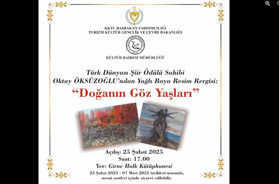 Türk Dünyası Şiir Ödülü sahibi Oktay Öksüzoğlu’nun “Doğanın Göz Yaşları” adını verdiği yağlı boya resim sergisi Kültür Dairesi’ne bağlı Girne Halk Kütüphanesi’nde açılıyor.