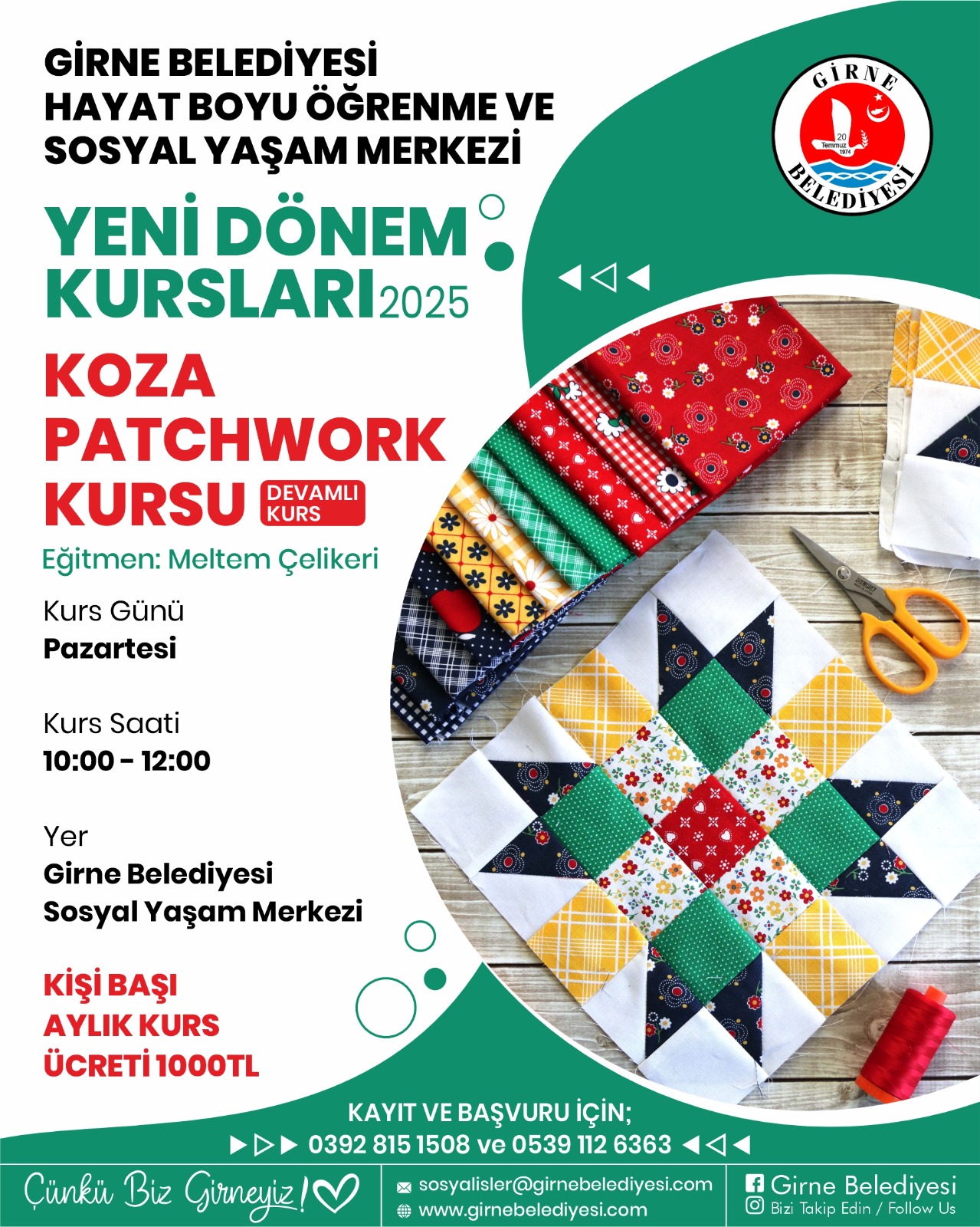 Koza patchwork kursu, Meltem Çelikeri’nin eğitmenliğinde düzenlenecek. Kurs, pazartesi günleri 10.00 -12.00 saatleri arasında Girne Belediyesi Sosyal Yaşam Merkezi’nde yapılacak.