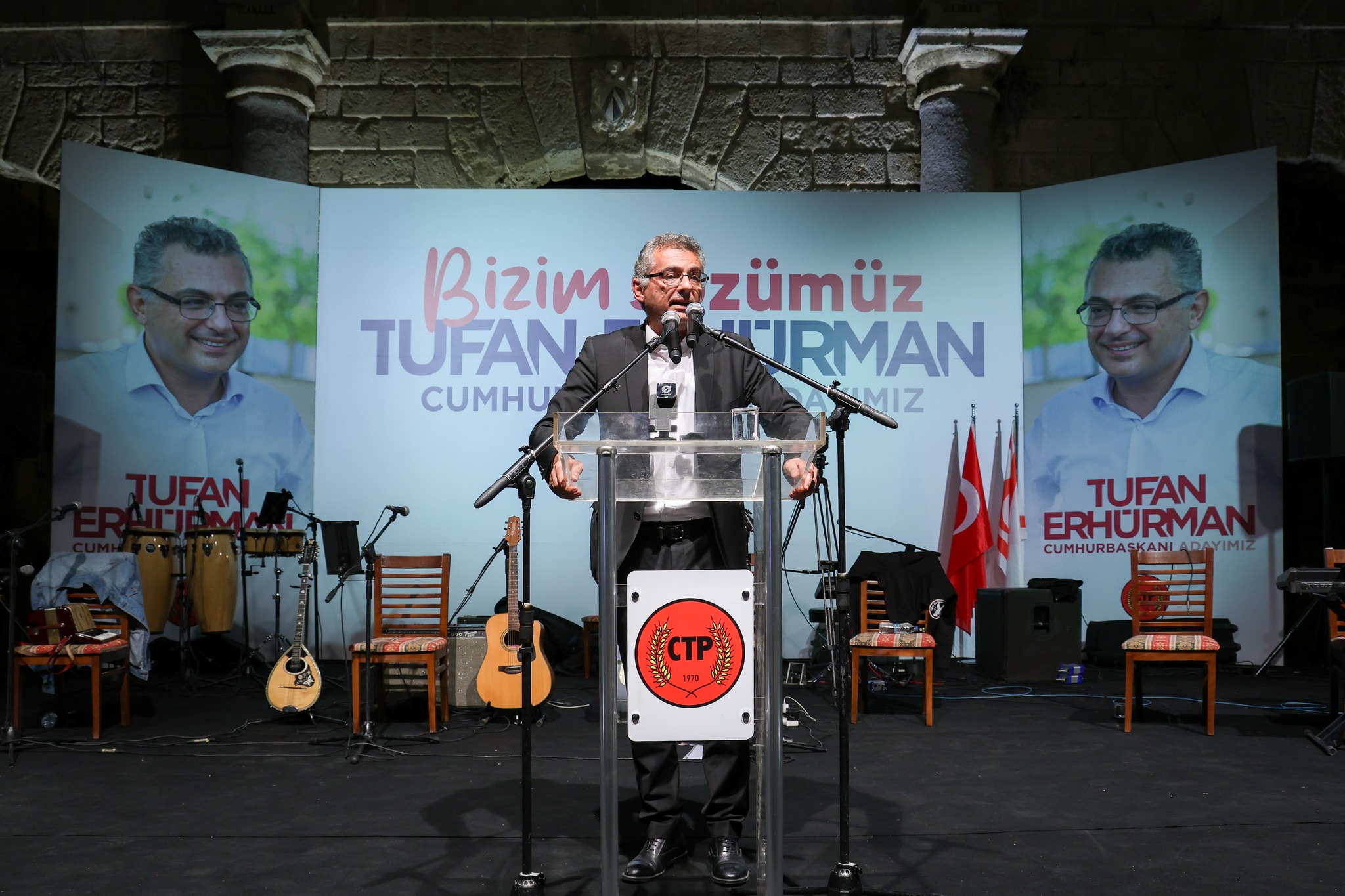 Ersin Tatar’ın, “20 fahri doktora aldım; 5 tane daha alacaktım. 5 sene daha verin de daha fazla alayım” sözlerini hatırlatan Erhürman, “Fahri doktora sembolik bir şeydir. Bu memlekette hakkıyla dünya çapında doktora yapan çocuklarım var; bu memlekette yaşamayı seçemiyorlar. Sen 20–30 yerden fahri doktora alacaksın diye, bu memlekette hakkıyla doktora yapmış çocuklarım “Ülkemi çok seviyorum ama nasıl geleceğim, eşitlik bulacağım, olanak bulacağım da üretmeye devam edeceğim” diye kara kara düşünüyor. Ben fahri doktora peşinde değilim; bu memleketi seven, bu memlekete dönmek isteyen, haklı, şanlı doktoralı çocuklarım dönsün diye uğraşacağım. Benim bir doktoram var, fahri değil” dedi. Tufan Erhürman, “Bu halkı Sarayönü’ne dizemeyeceksiniz. Bu halk dünyayla buluşacak. Ne yaparsanız yapın, bu halk hapsolmayacak. Dünyaya açılacak” dedi. “Yüreklerimizin üzerindeki o yük kalkacak; üç gün kaldı” diyen Erhürman, bu memleketi hep birlikte çok güzel yöneteceklerinin altını çizdi. Erhürman, “Cumhurbaşkanlığı seçimi oy pusulası hazır. Bizim yerimiz ikinci sırada. Bilin ki o gün sandığa gideceksiniz. Mührü kaldıracaksınız ama CTP’ye vurmayacaksınız. Tufan Erhürman’a da vurmayacaksınız. Yüreğinizde çocuklarınızın, torunlarınızın sevgisini, hasretini hissedeceksiniz. Yüreğiniz sımsıcak olacak ve çocuklarımıza, torunlarımıza, onların geleceğine vuracaksınız o mührü” diye ekledi.