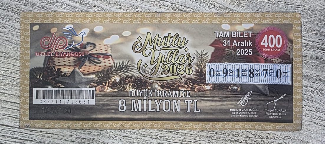 Devlet Piyangosu’nun 31 Aralık 2025 tarihli Yılbaşı Özel Çekilişi’nde 8 milyon TL’lik büyük ikramiyenin talihlisine teslim edildiği açıklandı.