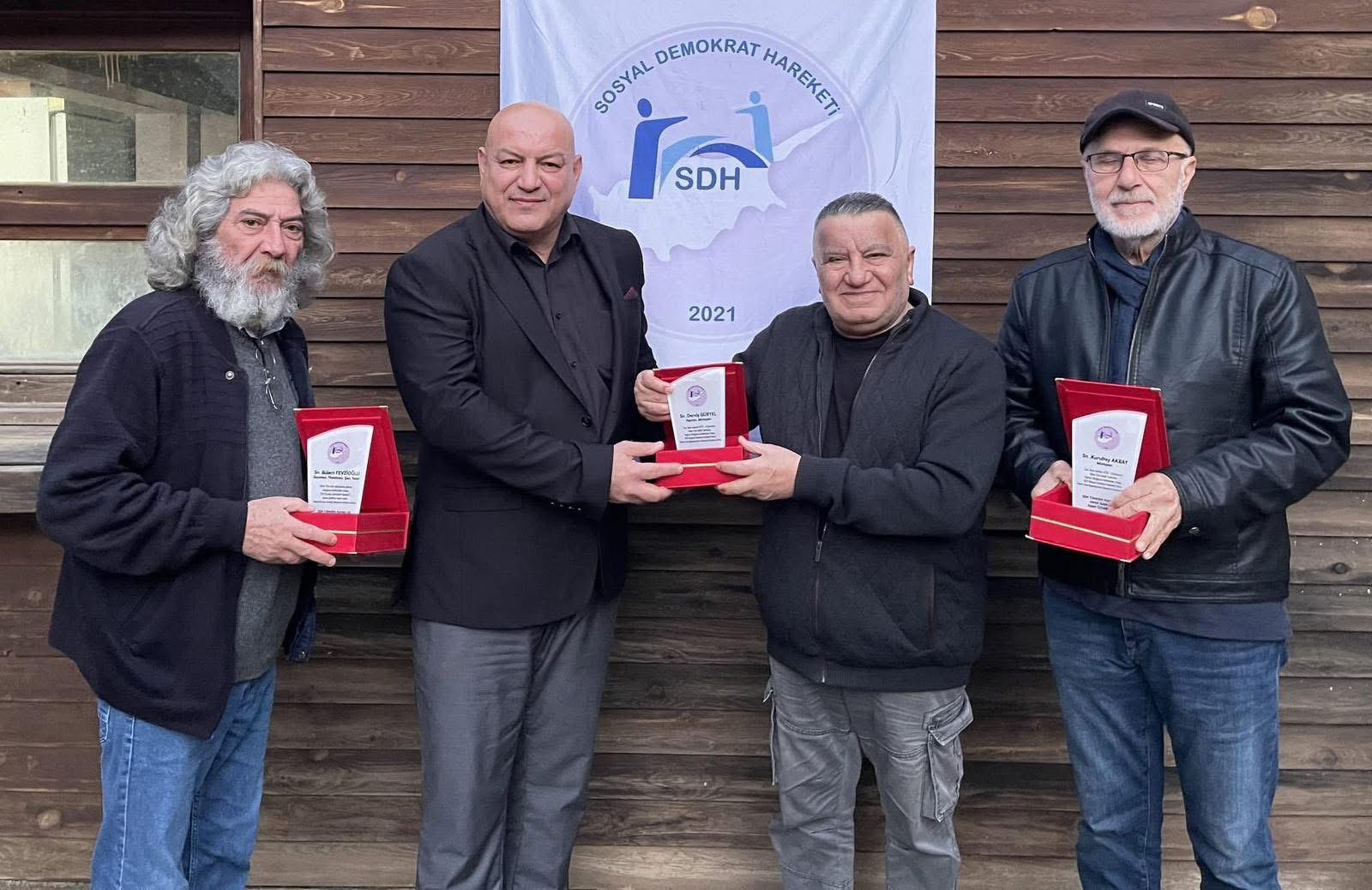 Gazimağusa İlçe Başkanı Mustafa Güvercin, Gazimağusa Kadın Kolları Başkanı Fatma Güvercin, Genel Başkan Yardımcıları Beşer Taşçı, Ahmet Bayraktar ve Varol Ateş ile Kadın Kolları Genel Koordinatörü Türkan Tuğrulöz’ün katılımıyla gerçekleştirilen törende; gazeteci, yazar, şair ve yönetmen Bülent Fevzioğlu, müzisyen Kurultay Akbay ile yönetmen, yapımcı ve müzisyen Derviş Güryel’e ülke sanatına sundukları katkılar dolayısıyla plaket takdim edildi.