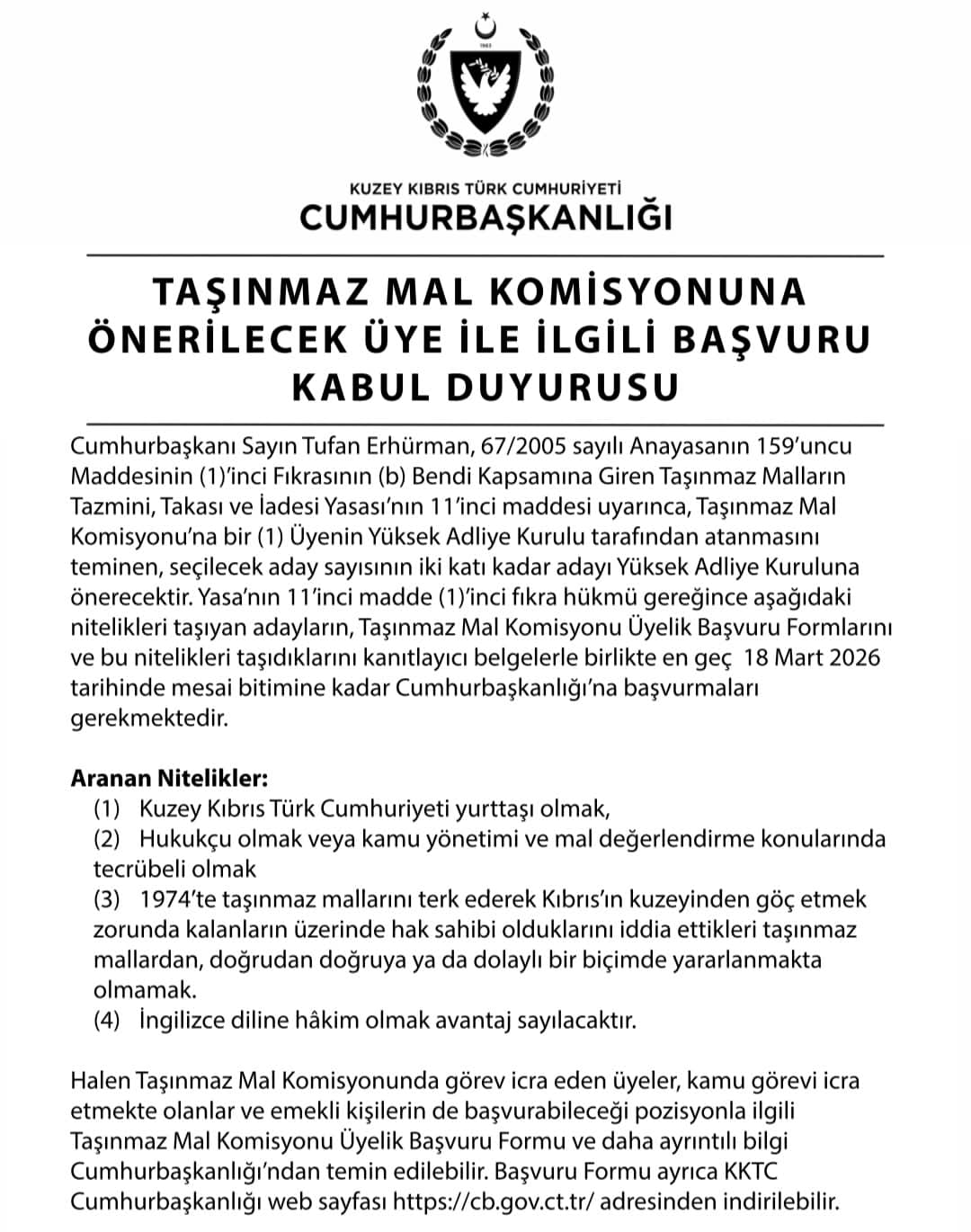 Cumhurbaşkanlığı’ndan yapılan açıklamada, Cumhurbaşkanı Erhürman’ın “67/2005 sayılı Anayasa’nın 159’uncu maddesinin (1)’inci fıkrasının (b) bendi kapsamına giren Taşınmaz Malların Tazmini, Takası ve İadesi Yasası’nın 11’inci maddesi uyarınca,” Taşınmaz Mal Komisyonu’na atanacak bir üye için aday önereceği belirtildi.