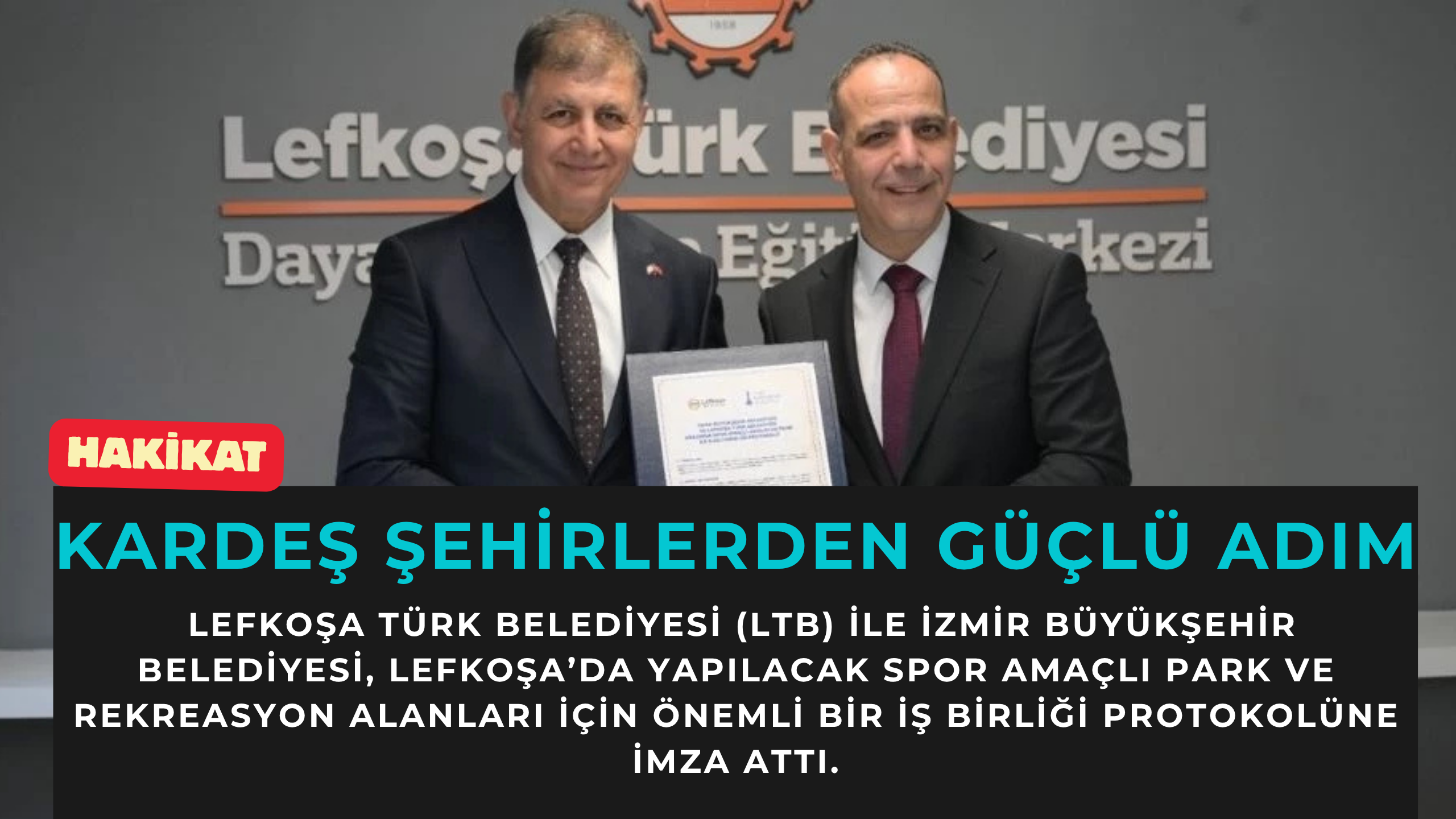Lefkoşa Türk Belediyesi (LTB) ile İzmir Büyükşehir Belediyesi, Lefkoşa’da yapılacak spor amaçlı park ve rekreasyon alanları için önemli bir iş birliği protokolüne imza attı. Protokol, LTB Başkanı Mehmet Harmancı ve İzmir Büyükşehir Belediyesi Başkan Dr. Cemil Tugay tarafından LTB Dayanışma ve Eğitim Merkezi’nde imzalandı.